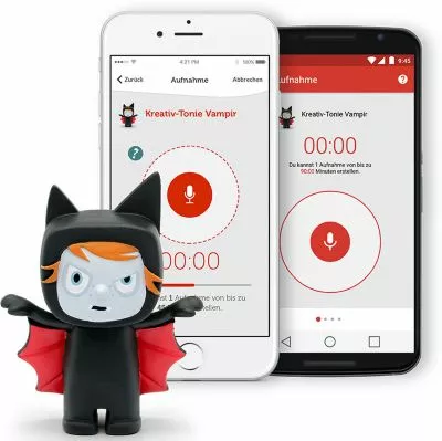 Mit der dazugehörigen, kostenlosen Smartphone-App können eigene Sprachaufnahmen aufgezeichnet und dem Kreativ-Tonie zugewiesen werden.